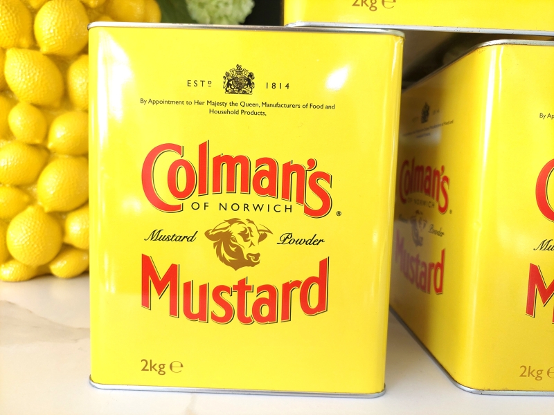 Vrolijke Colman's Mosterd blikken.