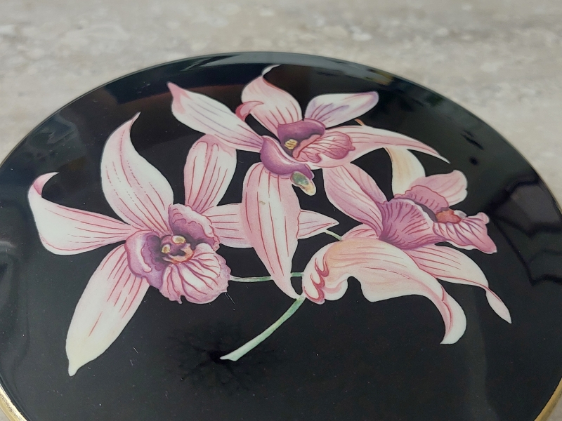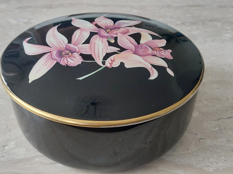 Diepzwart met gouden randje en prachtige orchideeën op het deksel.