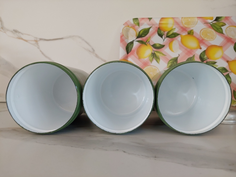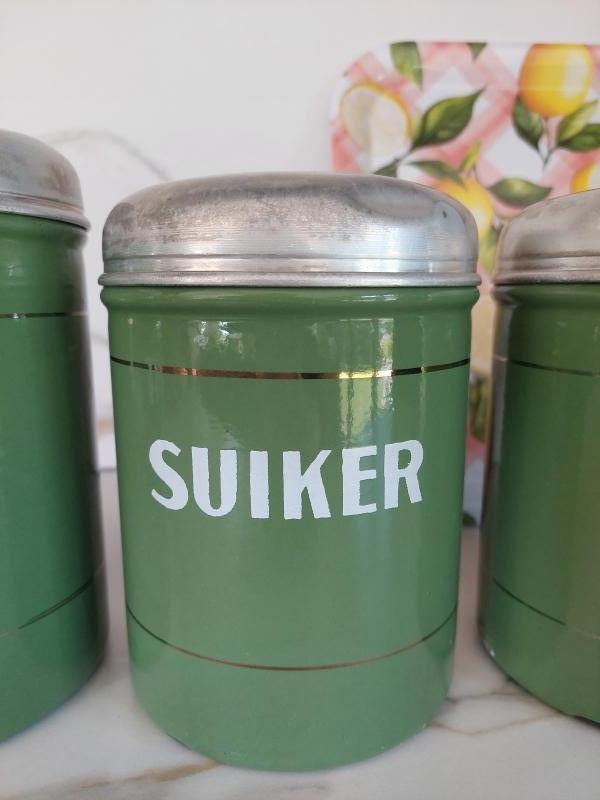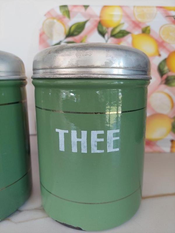 Diameter: 11 cm, Hoogte: 16 (thee/suiker) en 18 cm (beschuit)