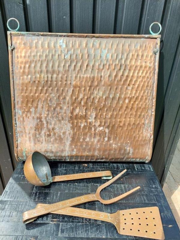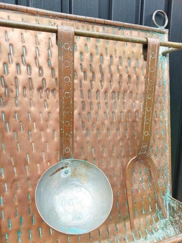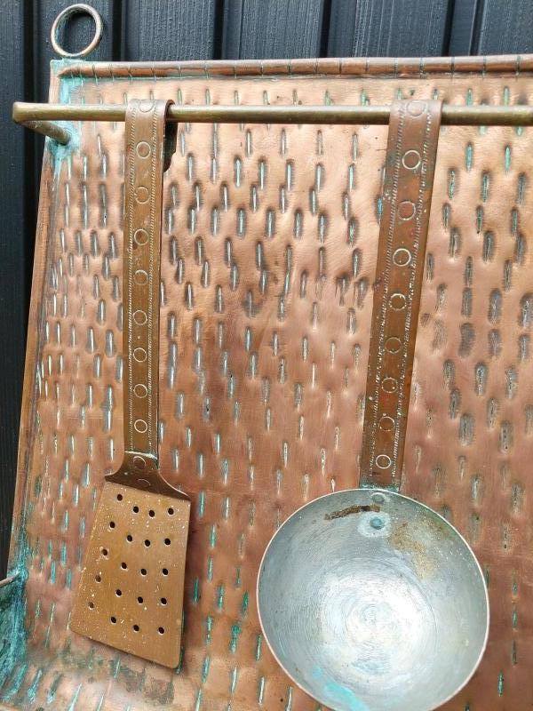 Prachtig Frans lepelrek van koper, met 3 accessoires.