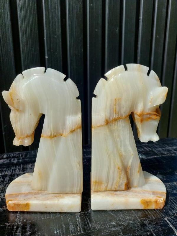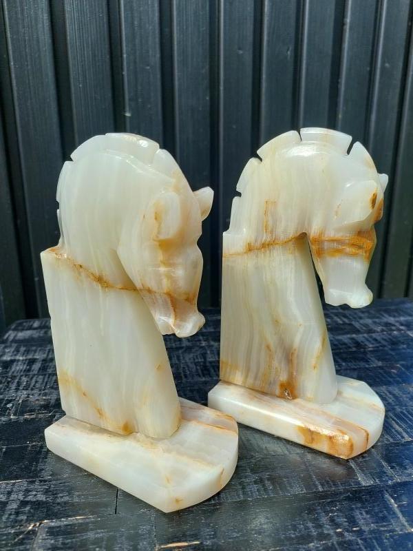 Voeg een vleugje natuurlijke elegantie en kracht toe aan uw interieur met deze schitterende boekensteunen in de vorm van een paardenhoofd. Elke steun is vervaardigd uit massief onyx, een natuursteen die bekendstaat om zijn unieke, gelaagde patronen en warme aardetinten. Hierdoor is geen enkel paar exact hetzelfde.